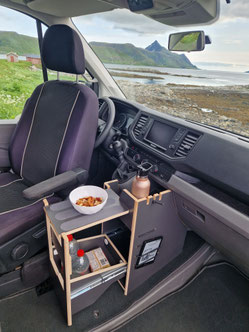Benny und Sonja haben sich in ihrem Volkswagen Crafter über den überflüssigen Platz zwischen den beiden Sitzen im Fond geärgert. Viel Raum ist hier zwar vorhanden, dieser kann während der Fahrt nicht sinnvoll genutzt . Größere Kisten oder Material könnten hier verstaut werden, spätestens am Zielort angelangt würden diese jedoch wieder den Weg von Vorne nach Hinten versperren und sind im Weg, wenn die Drehsitze in die Wohnkonfiguration gedreht werden sollen.